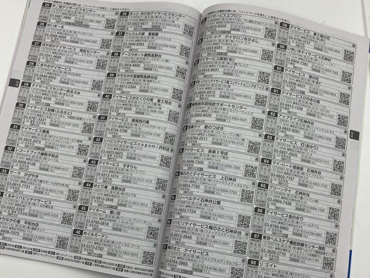 地域のデイサービス・訪問介護・特養など、事業所の連絡先・QRコードつきリストが掲載されています。
