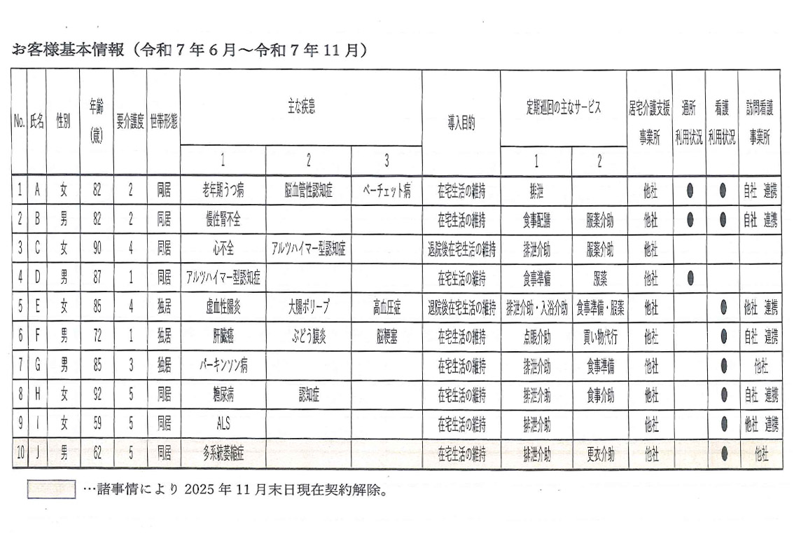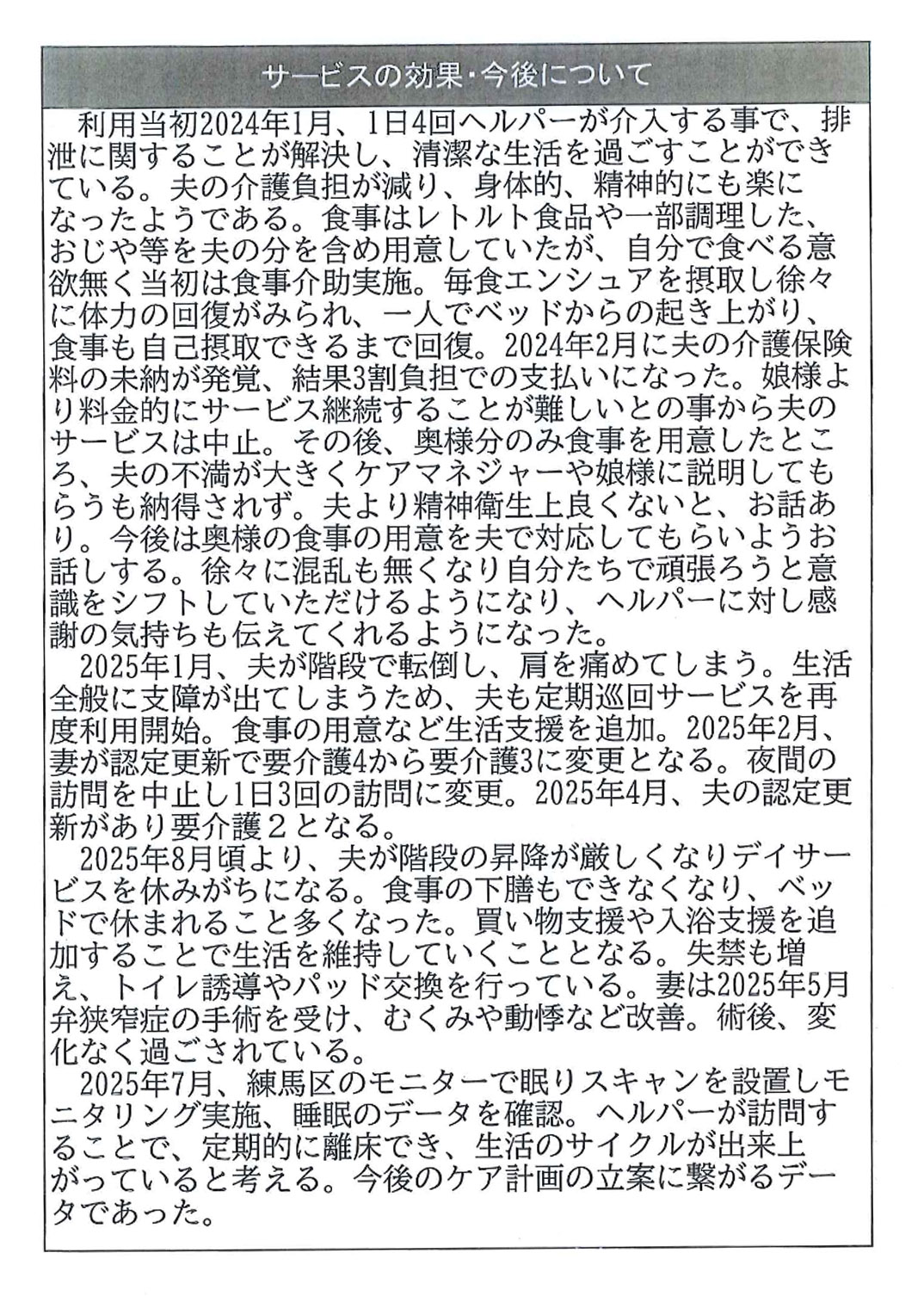 A:ご主人は介護度が上がって、3割負担のまま。介護度に関しては1から2にあがった。奥さんは逆に介護度が下がり、4から3になりました。奥さんは1割負担。奥さんだけのサービスだったんですけど、ご主人が肩を痛めたことをきっかけに、段々と衰えたので、娘さんに確認したら「お願いします。」ということで3割負担のままでサービスを再開した。6階に住んでるんですけど、もう降りられない。元々よくなってきたら、また定期巡回の契約を終了の予定です。一方で、(痛めた)肩が治ったら終了しようと話をしていたが、できないこと増えていった。以前はご主人が買い物に行っていたんですけど、それが今では、できなくて、ヘルパーと娘さんで買い物にいっている状態。特に疾患はないので、体力的な部分かなと考えています。失禁も増えてきて、ADLも落ちてきた。お二人ともいま入浴介助をしています。逆に言えば、そういった状態の変化に合わせて、臨機応変に動けるのが定期巡回のいいところだと思います。