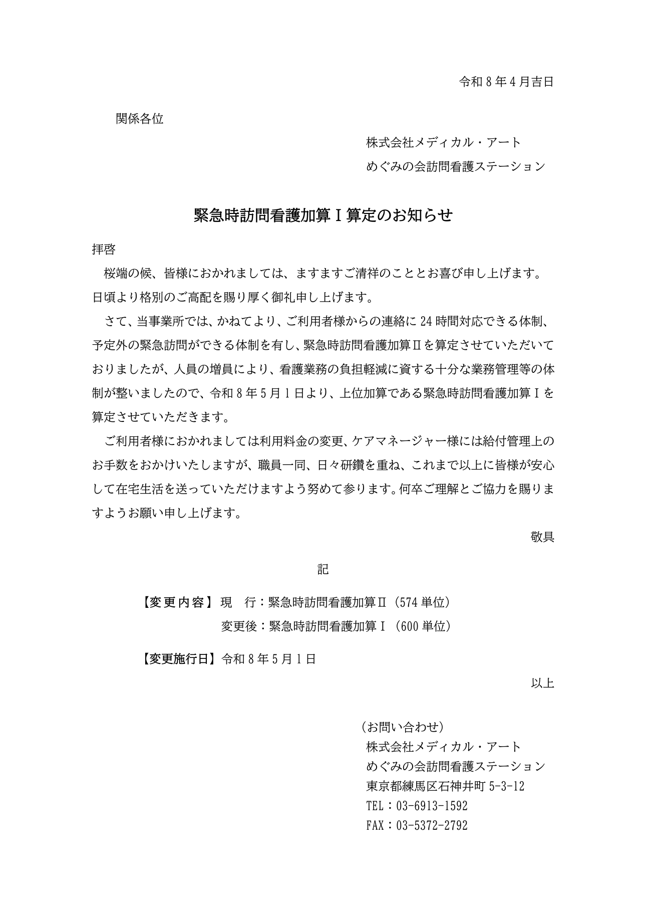 令和8年5月1日より、「めぐみの会訪問看護ステーション」は、「緊急時訪問看護加算I」を算定させていただきます。変更内容の詳細は、以下のお知らせ本文をご覧ください。