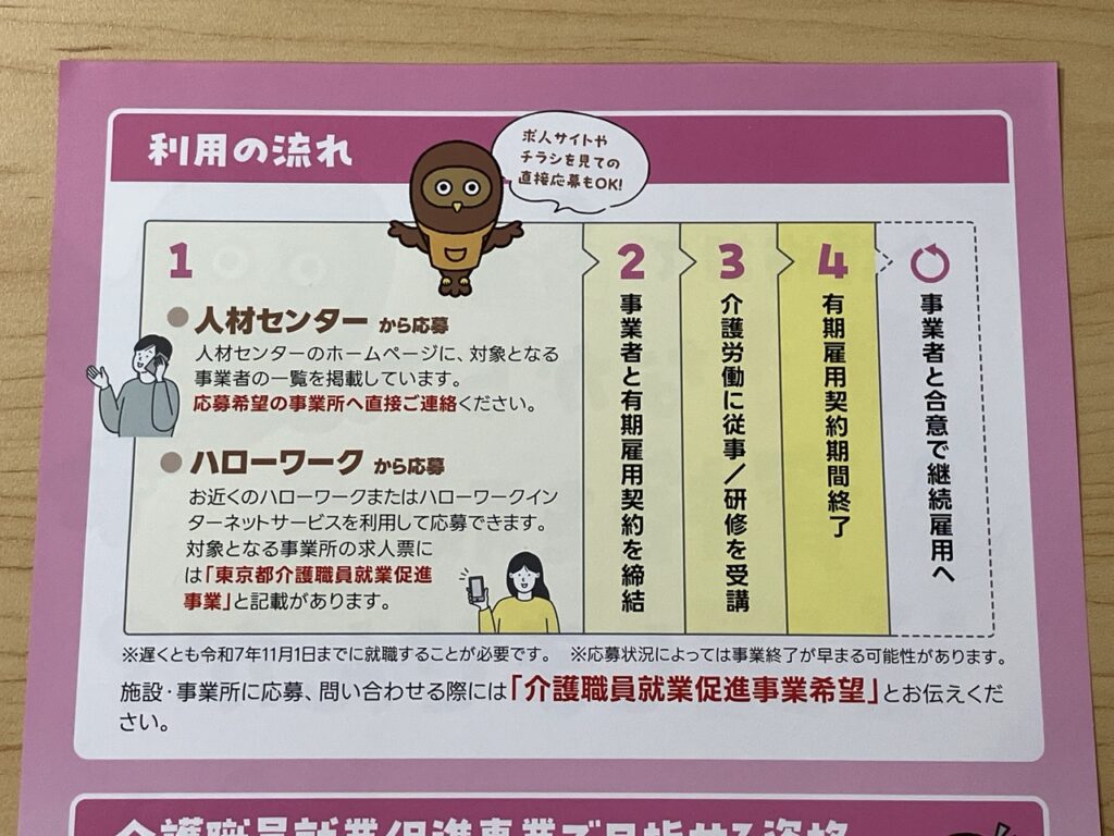 東京都福祉人材センターの一覧から応募希望の事業所へ連絡をするか、ハローワークから応募。