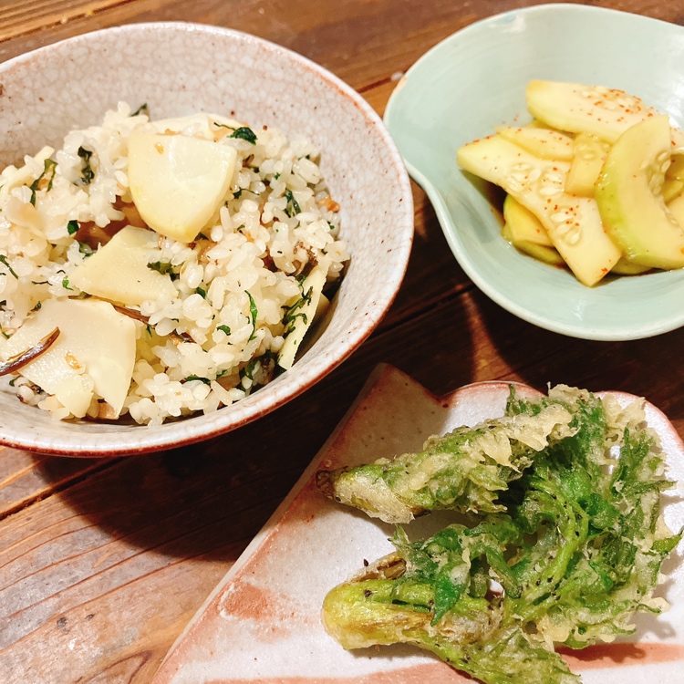 ●筍ご飯、タラの芽天ぷら、メロン漬け…「初物を富士皿で更に縁起良く!食す!!」