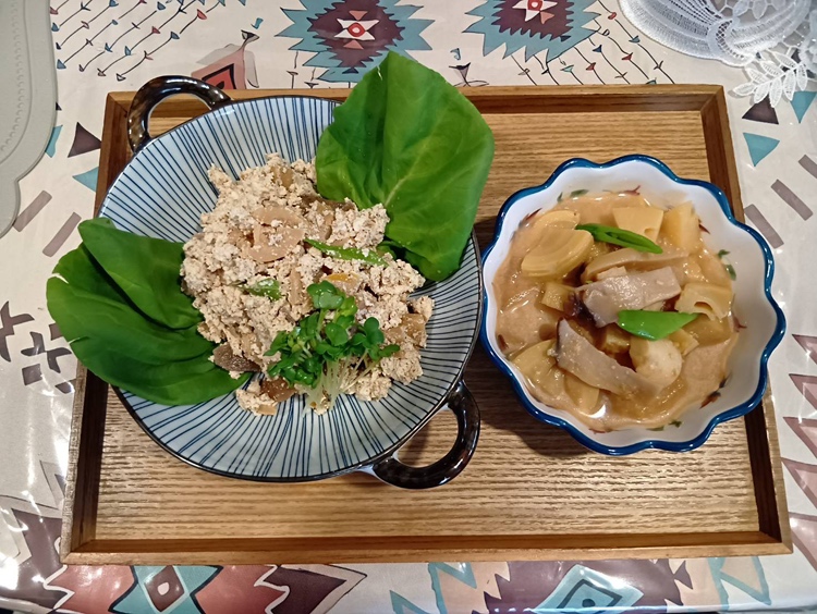●お豆腐の白和えと、タケノコの味噌煮…「筍が柔らかいので、入れ歯の私でも、食べられました😁田舎の精進料理で、良く、出ていました。」