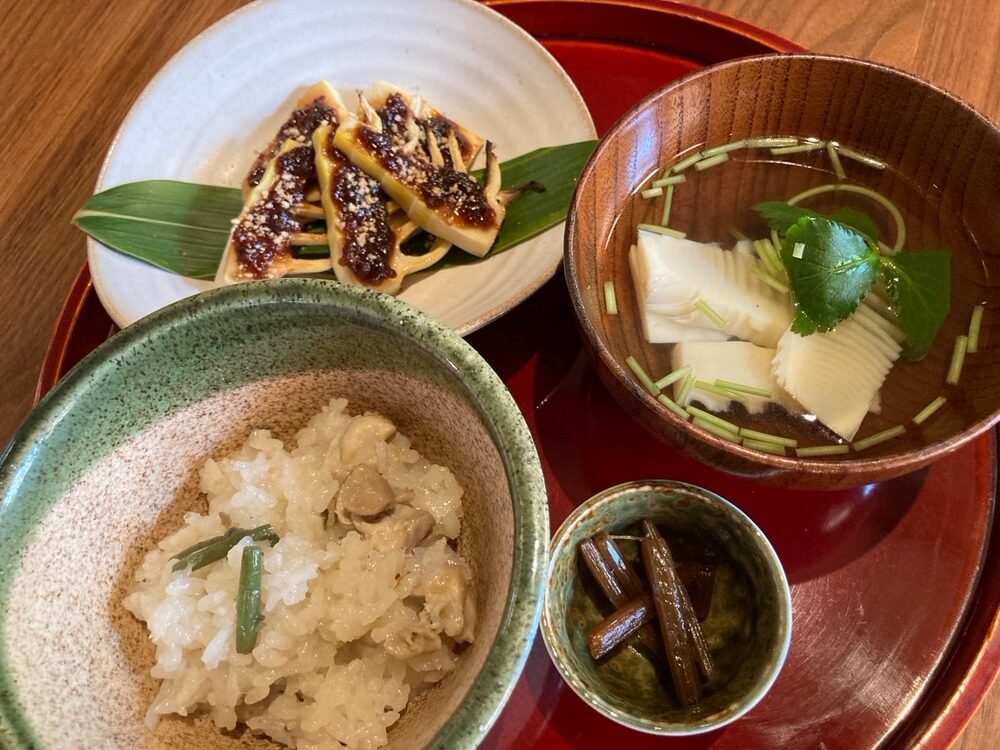 「めぐみガーデン」で提供される昼食のタケノコご飯になりました。