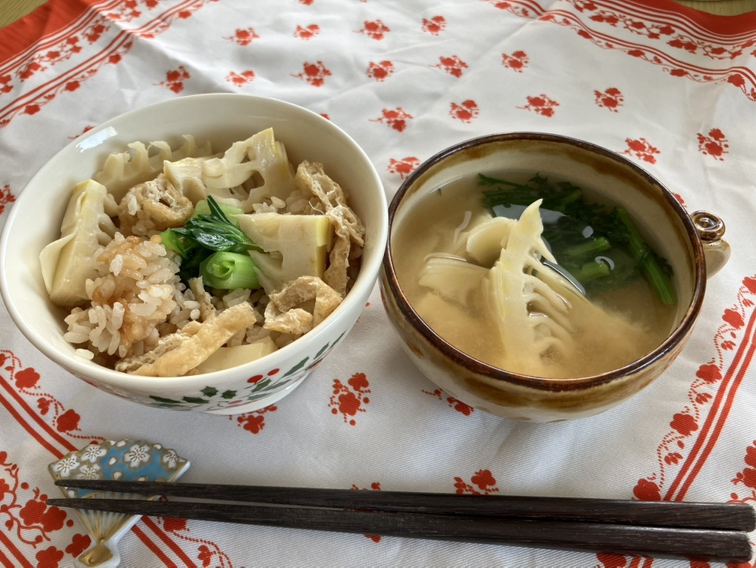 ●たけのこご飯とお味噌汁…「とても新鮮で、香りよく、アクも少なくて、柔らかく下茹で時間も短くで大丈夫でした。」